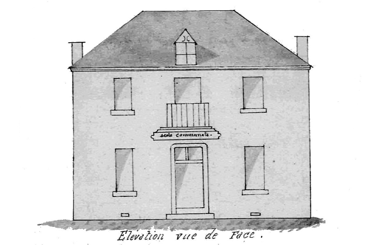 – Oô en 1885, un bâtiment comprenant au rez-de-chaussée une salle de classe à deux entrées distinctes pouvant accueillir 56 élèves, deux préaux, deux cours et à l’étage un logement avec trois chambres pour l’instituteur.